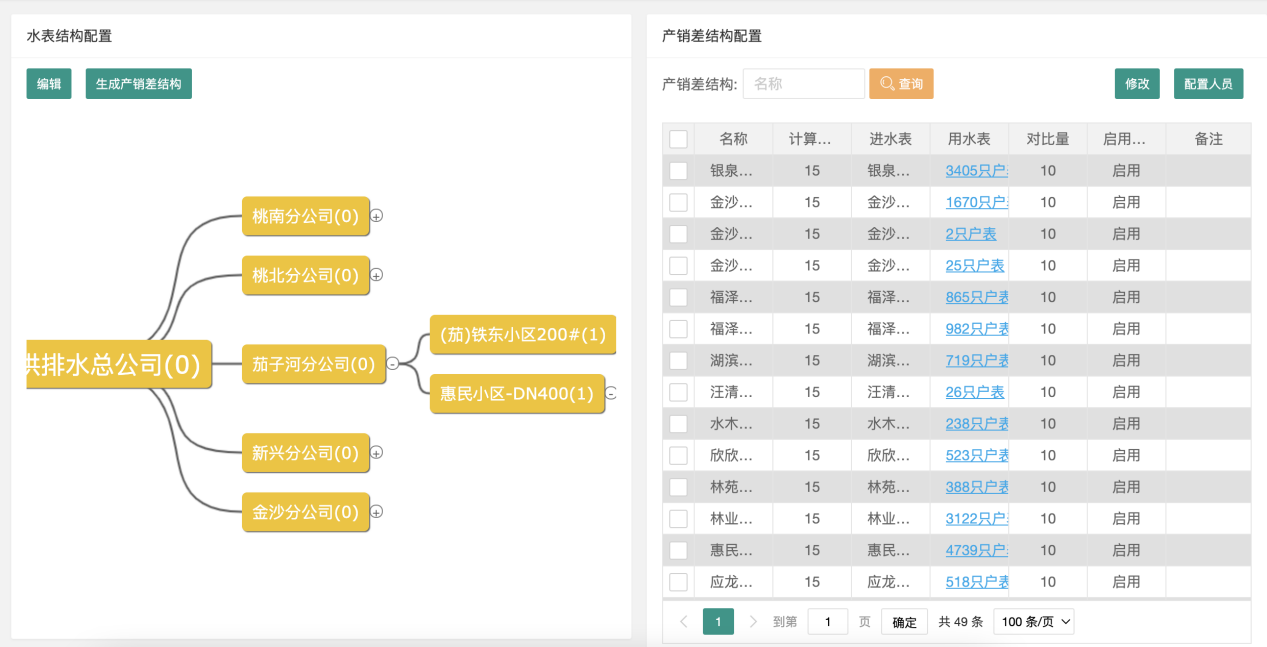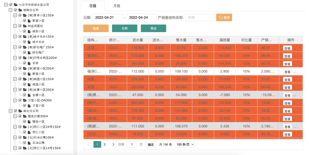 以管网GIS、物联网设备数据采集、智能数据分析为基础,与收费、表务、调度及二次供水设施管理等系统的数据融合,结合管网漏损分析模型,对DMA分区计量进行管理和评估。基本功能包括DMA分区计量建立,计量区域漏损量、产销差计算分析,对供水管网独立计量区域的水量、水压、水质等重要参数进行监控,跟踪分析夜间最小流量变化趋势,及时评估和反馈计量区域漏损程度,定制经济长效的漏损控制策略。
